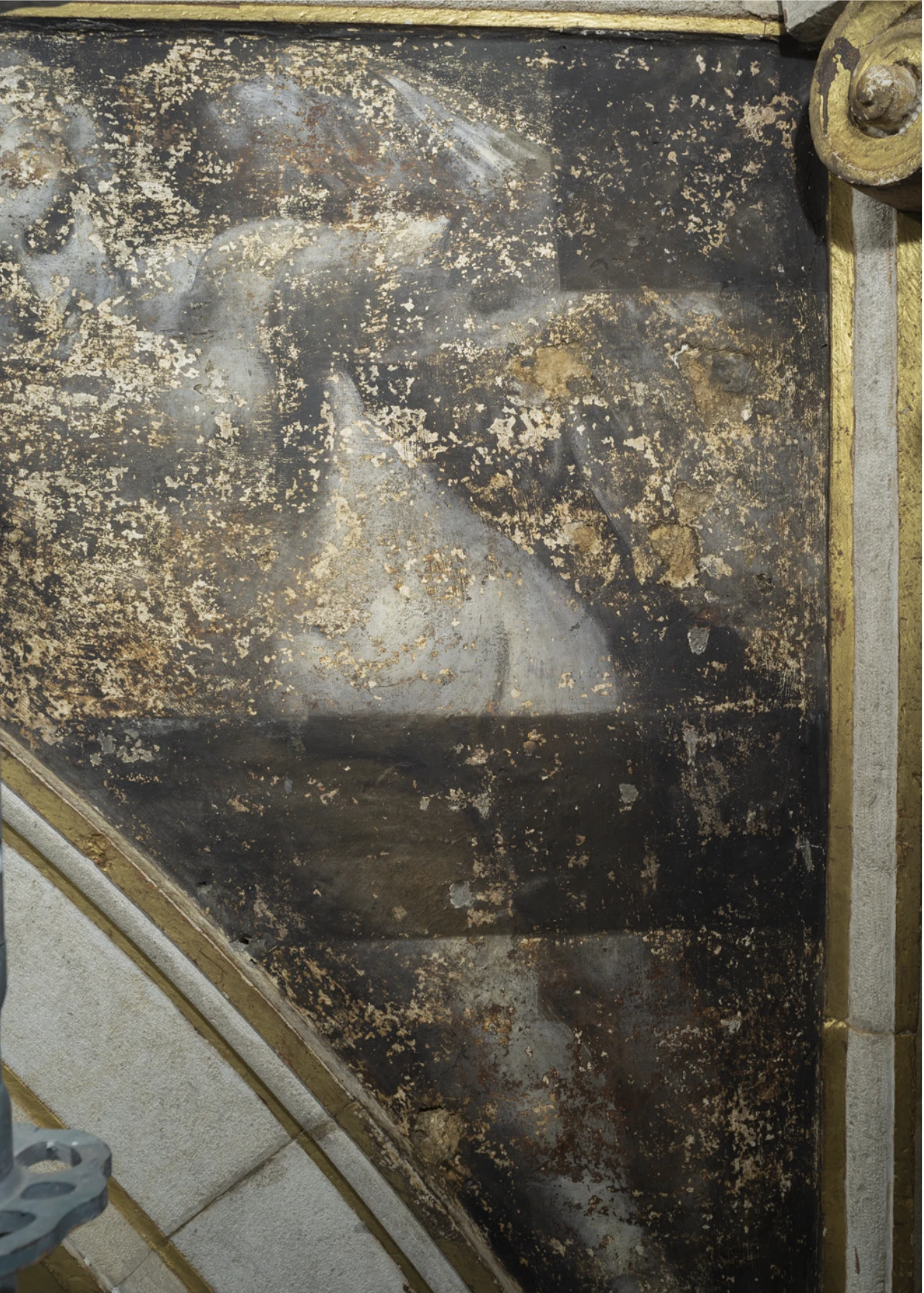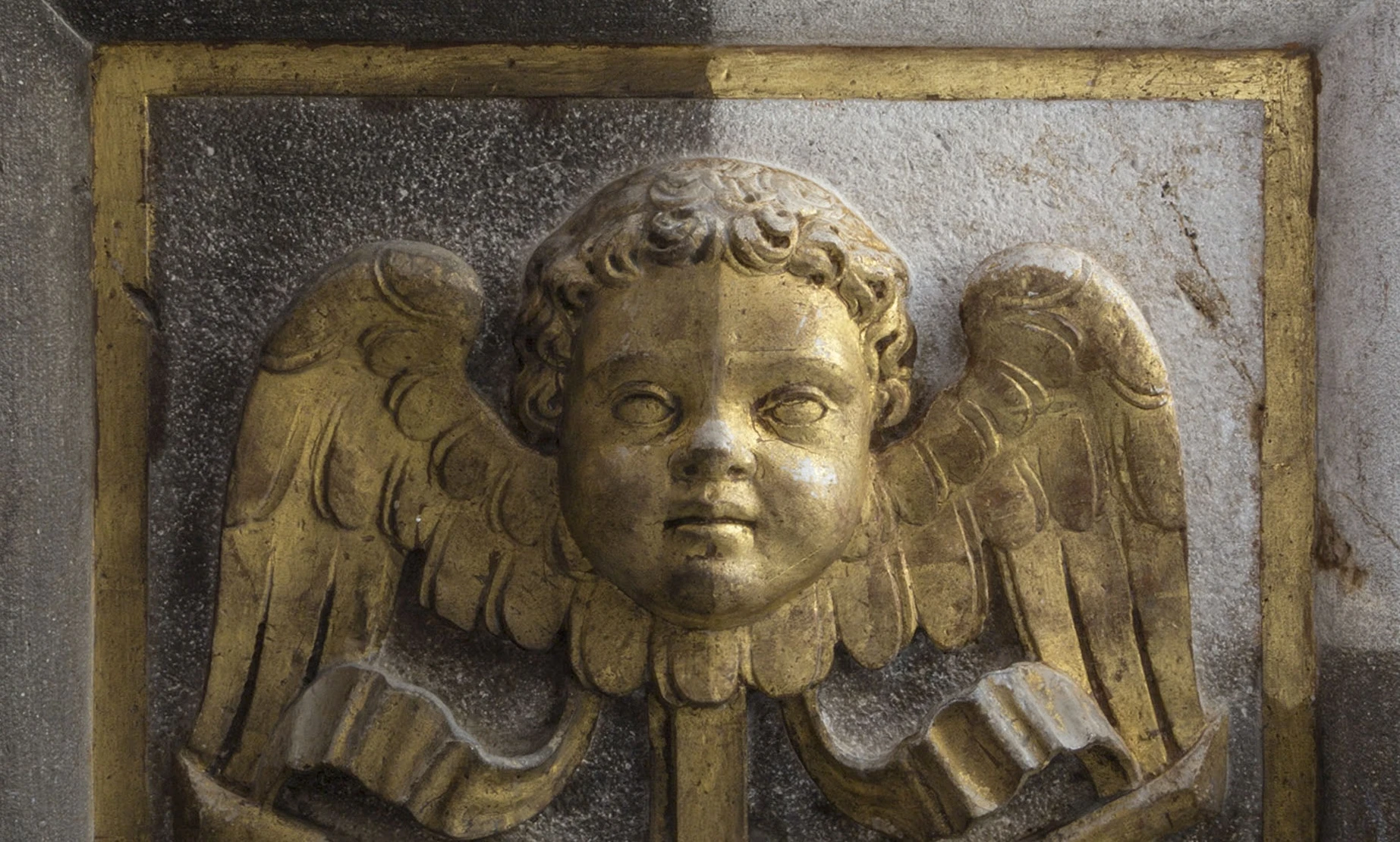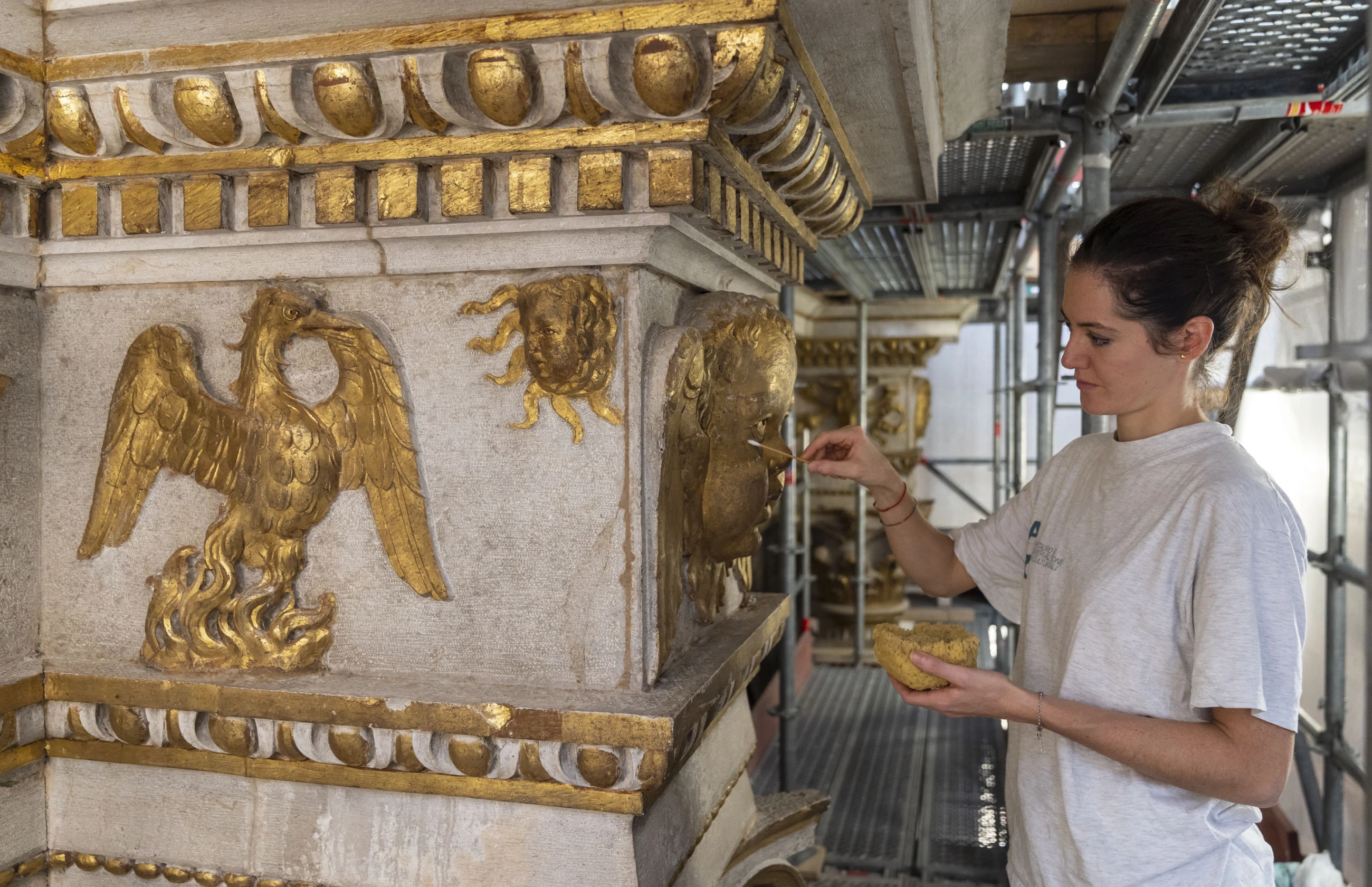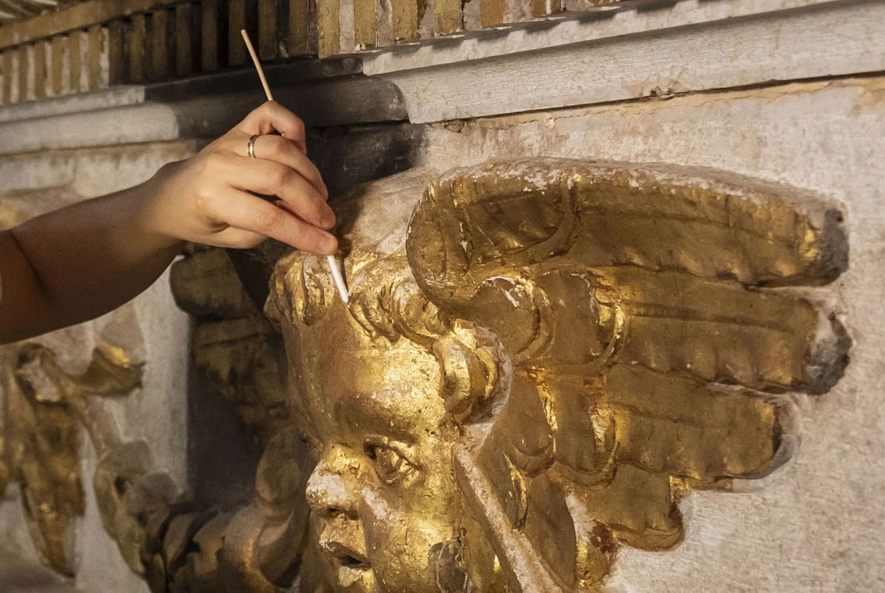 Witness the recovery of the marble’s original white tone, unveiled after centuries of obscurity beneath layers of candle smoke and dust. Marvel at the unexpected discovery of two frescoed putti hidden within the spandrels of the frame, their existence long forgotten. Admire the meticulous restoration of the frame’s original gilded decoration, brought back to its former glory with cutting-edge laser technology.